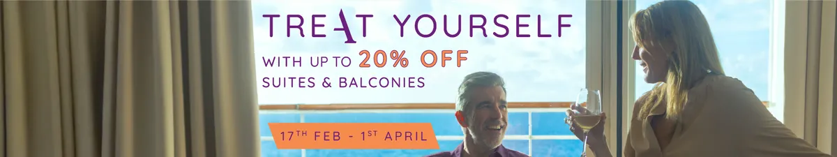 Step onboard and Treat Yourself to a memorable escape with up to 20% off Balcony and Suite cabins. Enjoy a private balcony with peaceful sea views and a suite that’s just the right size for relaxing. It’s the perfect way to unwind and leave the everyday behind, because moments matter.