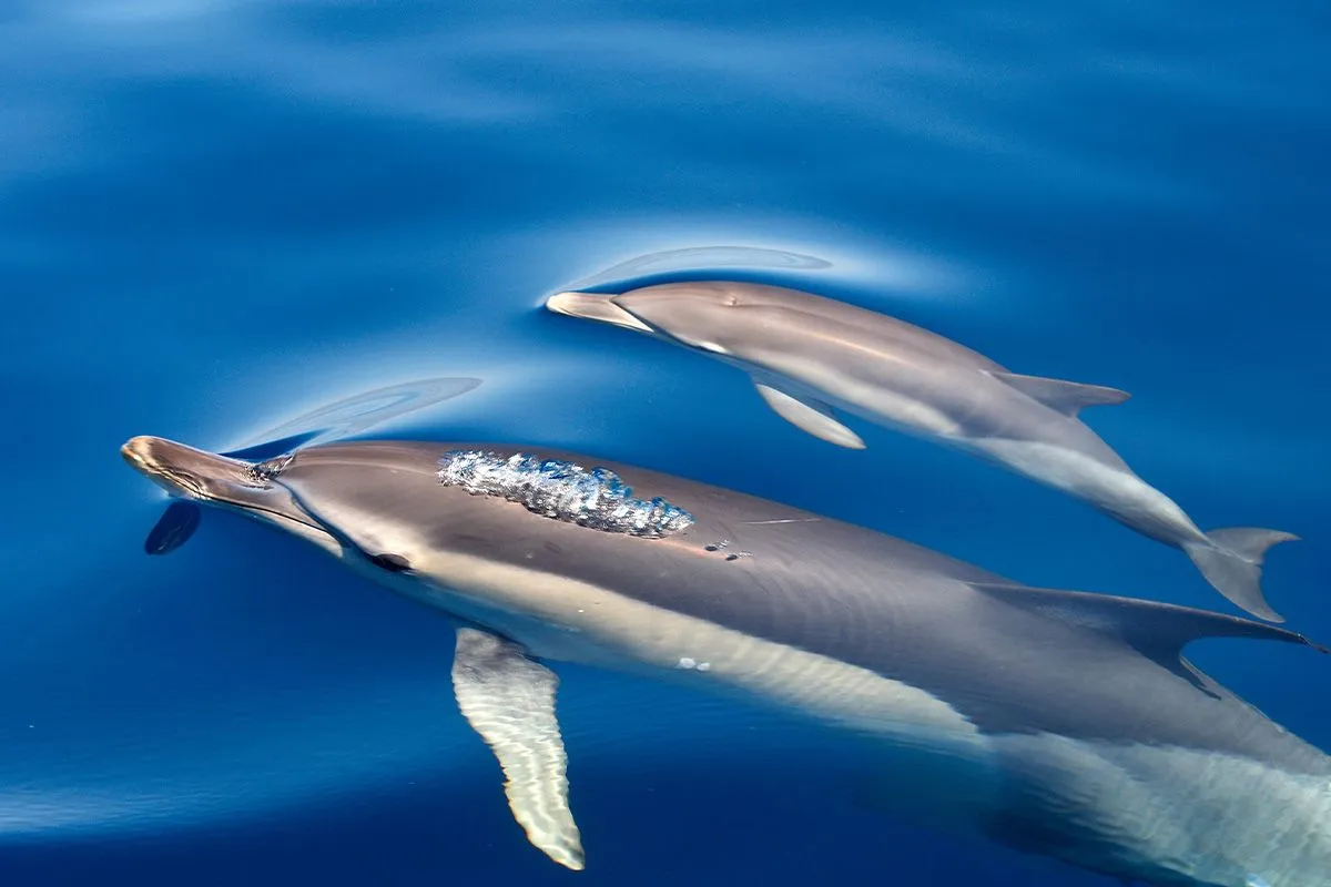 We often see common dolphins and bottlenose dolphins. Both long and slender with distinct beaks and curved, dark dorsal fins, these dolphins are energetic and active, often found flitting between the waves and playing with one another.