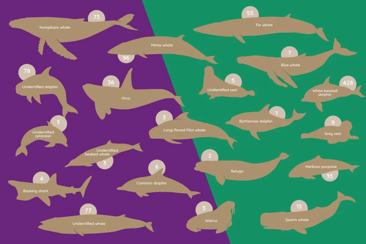 Below, you can see a summary of all the sightings recorded by ORCA onboard Ambience and Ambition between just April and June 2023.