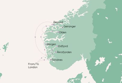 In Sandnes, explore the landscapes surrounding the Boknafjord, while scenic cruising through Akrafjorden offers close-up views of narrow fjords and towering rock walls. Discover coastal life and historic charm in Bergen, where you can explore the UNESCO-listed Bryggen waterfront, ride the Fløibanen funicular for panoramic views, and enjoy local markets and cafés. Experience Norway’s natural grandeur in Olden, with excursions to glacial lakes and the Briksdal Glacier, before sailing into Geiranger, one of the country’s most famous fjords, known for steep cliffs, cascading waterfalls and breathtaking viewpoints.
