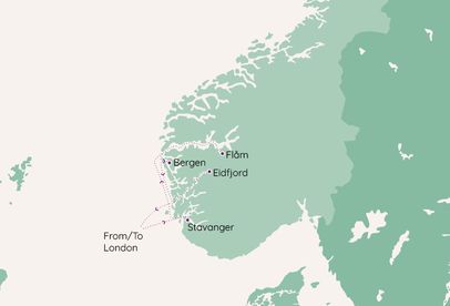 Explore Stavanger’s colourful harbour and historic streets before sailing deeper into the fjords to Flåm, where towering mountains rise straight from the water. Here, you may choose to experience the famous Flåm Railway, renowned for its breathtaking views through steep valleys and alpine landscapes. Continue to Bergen, known for its historic waterfront, lively cafés and cultural charm, before arriving in peaceful Eidfjord, surrounded by dramatic cliffs and still waters at the end of the fjord.