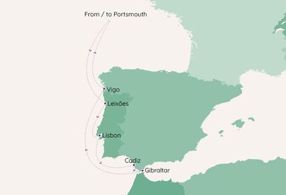 Sail roundtrip from Portsmouth on this 12-night Iberian cruise aboard Ambition, exploring the Atlantic coastlines of Portugal and Spain. The itinerary includes Leixões, Lisbon, Cádiz, Gibraltar and Vigo, combining historic cities, scenic coastlines and a relaxed southern European pace of life.