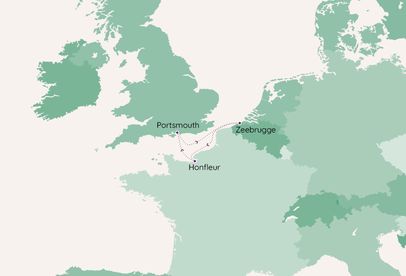 Sail from Portsmouth to Zeebrugge, the gateway to Bruges, where picturesque canals, medieval architecture and cobbled streets invite gentle exploration. In Honfleur, discover one of France’s prettiest harbours, known for its artistic heritage, pastel façades and relaxed café culture set around the old basin.