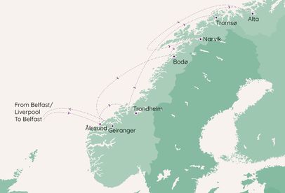 This 16-night Arctic Norway cruise sails roundtrip from Belfast, with an additional call in Liverpool, carrying you deep into Norway’s far north aboard Ambition. Designed as a voyage of scale and contrast, the itinerary moves steadily from familiar waters into landscapes where light shifts subtly, distances feel wider and nature takes centre stage.