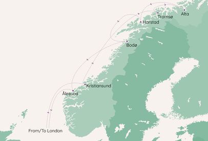This 14-night Arctic Norway cruise sails roundtrip from London Tilbury, venturing deep into Norway’s far north aboard Ambition. The journey builds steadily, carrying you into landscapes defined by scale, silence and northern light.