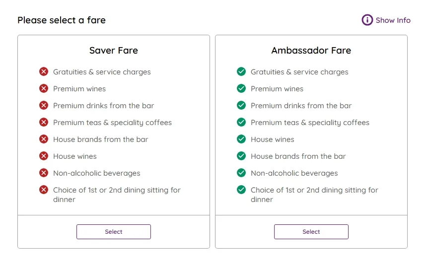 Saver Fare offers a lower upfront price, while Ambassador Fare includes the top drinks package with a 15% saving, all gratuities and additional onboard comforts. Both fares allow you to choose your cabin at the time of booking.