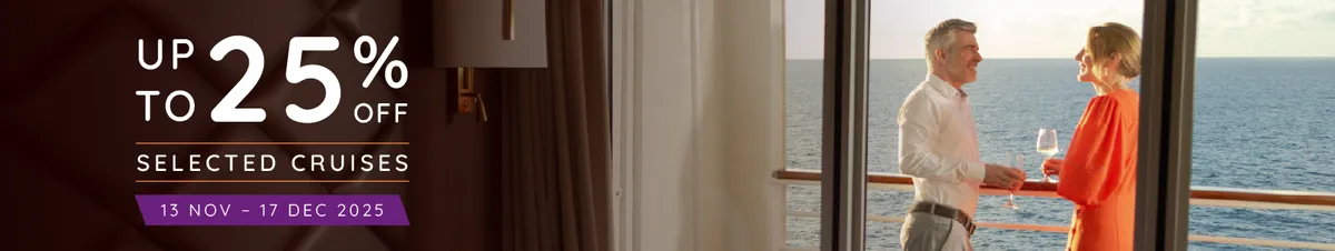 Valid on new bookings only made between 0900, 13th November 2025 to 23.59 17th December 2025. Discounts apply to Saver or Ambassador fare (cruise fare only), for up to two adults sharing a cabin. Please note: 3rd/4th berth are not eligible for the discount. The offer is available on selected sailings and cabin categories only. At the start of the promotion, 16% of the total cabin availability included in the promotion is discounted by 25%. Other discounts vary by sailing and cabin type. Savings are based on the average pre-promotion prices for the relevant cabins between 15th October 2025 and 12th November 2025. Fares subject to availability and may be withdrawn or changed without notice.
