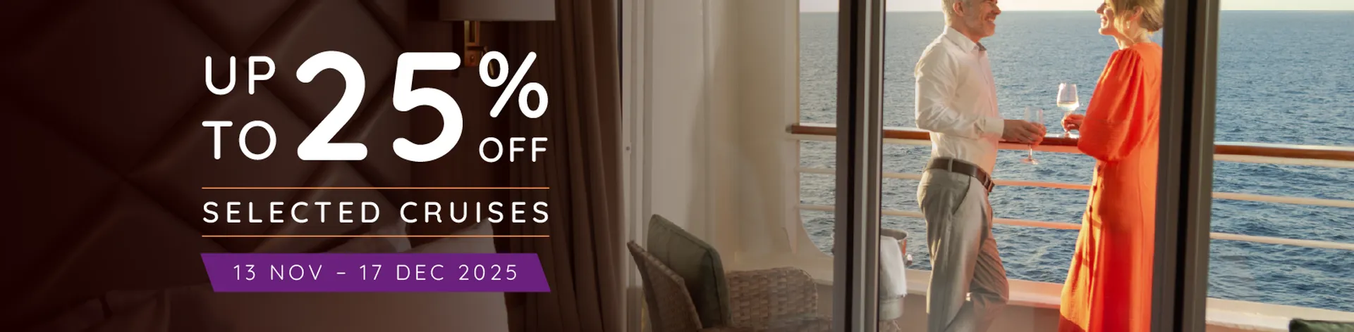 Valid on new bookings only made between 0900, 13th November 2025 to 23.59 17th December 2025. Discounts apply to Saver or Ambassador fare (cruise fare only), for up to two adults sharing a cabin. Please note: 3rd/4th berth are not eligible for the discount. The offer is available on selected sailings and cabin categories only. At the start of the promotion, 16% of the total cabin availability included in the promotion is discounted by 25%. Other discounts vary by sailing and cabin type. Savings are based on the average pre-promotion prices for the relevant cabins between 15th October 2025 and 12th November 2025. Fares subject to availability and may be withdrawn or changed without notice.