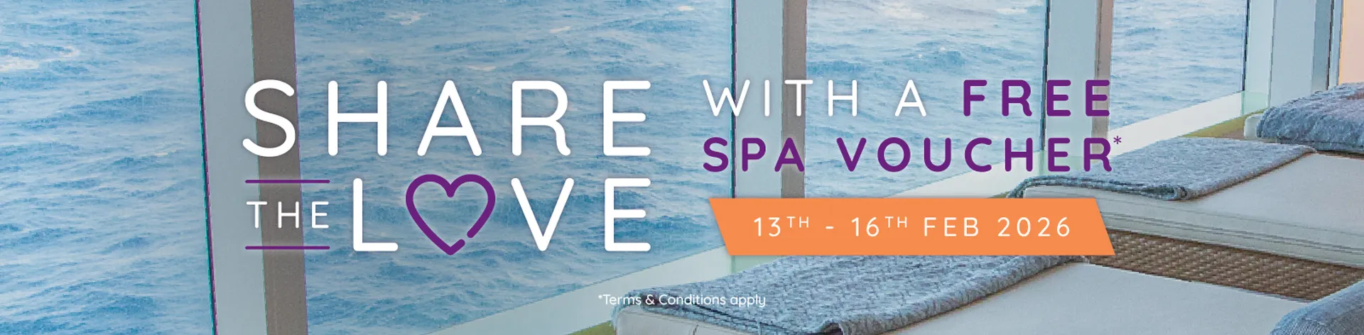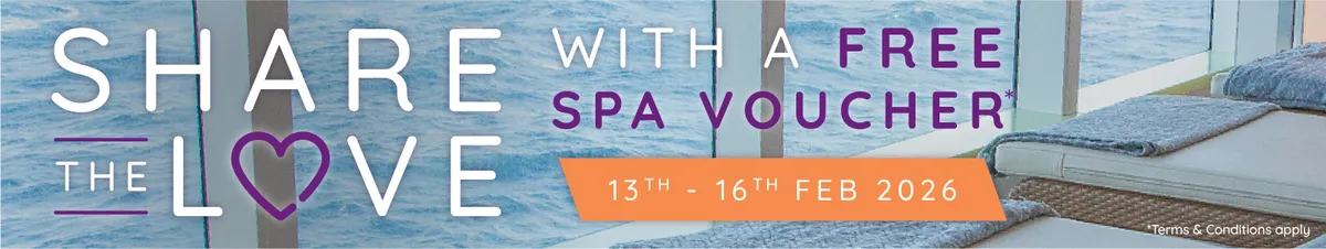 Free Spa Voucher is valid for all new bookings on 2026/2027/2028 season sailings up to 5 nights only from 08:00 13th February 2026 until 23:59, 16th February 2026 inclusive. Free Spa voucher is issued per cabin based on 2 sharing – Spa voucher per cabin will be issued based on the cabin category booked - £20 Inside, £40 Ocean View, £60 Balcony, £80 Suite. Solo bookings will receive 50% of the equivalent value based on cabin category booked. Spa voucher is only valid for treatments (subject to availability) and not products sold. The voucher has no cash value and no refund will be issued for vouchers not claimed or part used. There is a maximum of 10 Spa vouchers available per cruise code included in the promotion. Fares subject to availability and promotion may be withdrawn or changed without notice. For full terms and conditions visit www.ambassadorcruiseline.com. Free Spa voucher is not valid on any festive/in port events, Multi-Generational cruises, charters, Fly cruises or any booking made outside of the promotional dates or cruises more than 6 nights.