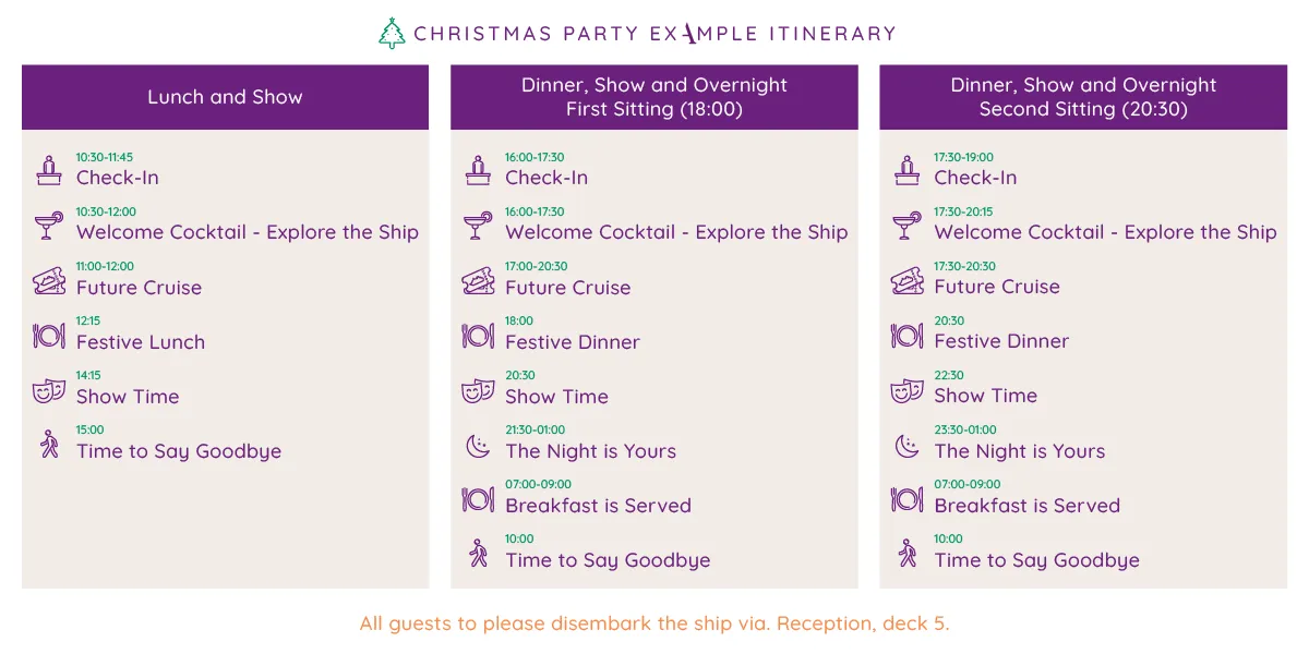 Make your celebration last longer with our complete Overnight Festive Experience. There’s no need to worry about taxis or cutting the night short - simply retire to your comfortable cabin once the festivities draw to a close.